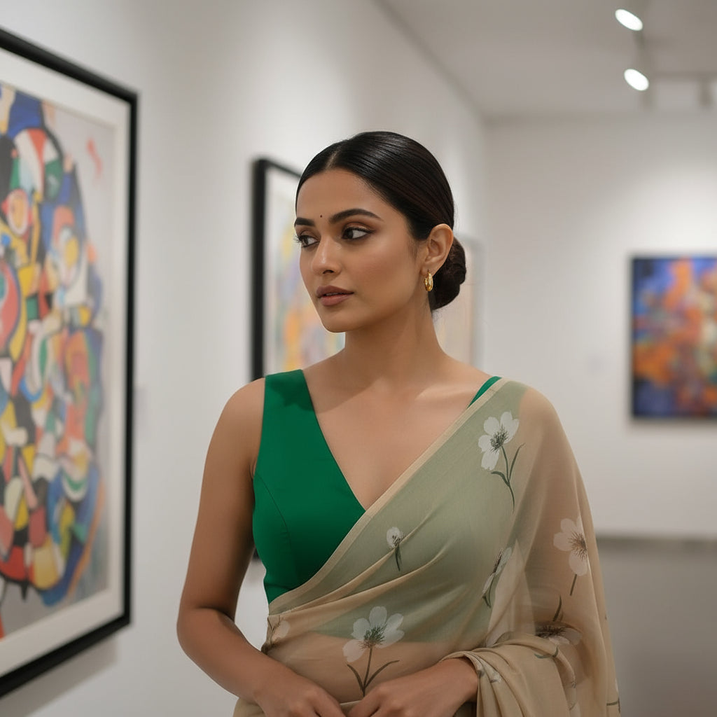 1.Pair with printed or heavily embellished sarees like Kalamkari, Banarasi, or brocade for a balanced look.